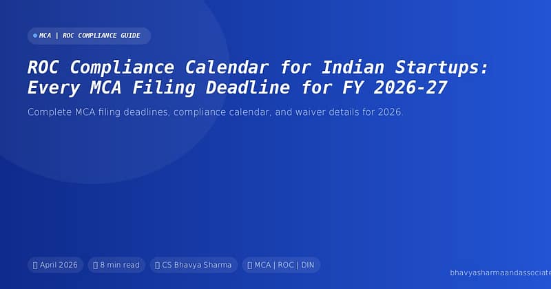 The complete ROC and MCA compliance calendar for FY 2026-27: every form, every deadline, and every penalty your Indian startup needs to know — from AOC-4 and MGT-7 to DPT-3, DIR-3 KYC, and post-funding FEMA filings. Updated for the new triennial KYC rule and CCFS 2026 amnesty scheme.
